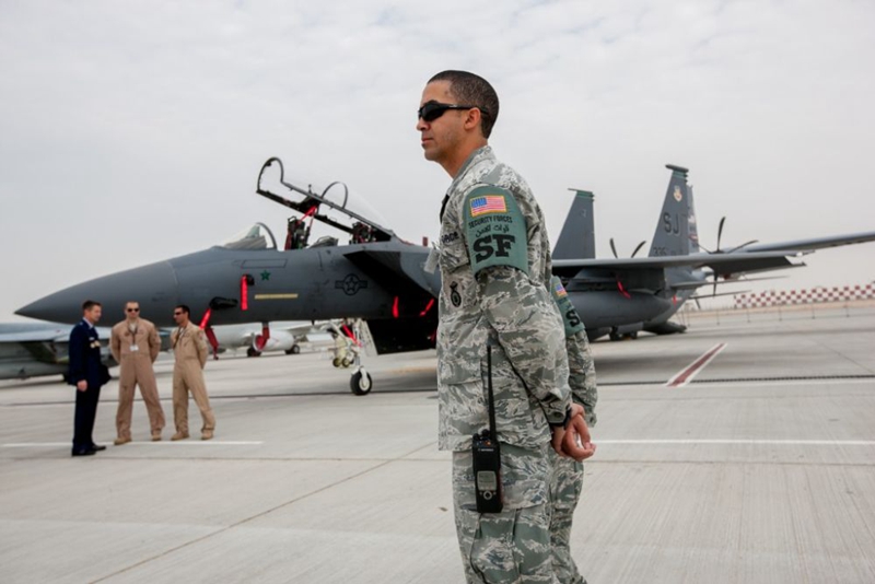2013年11月17日,在阿聯酋迪拜阿勒馬克土姆國際機場,一名美軍士兵在參展的F-15戰鬥機旁警戒。(新華社記者崔新鈺攝)