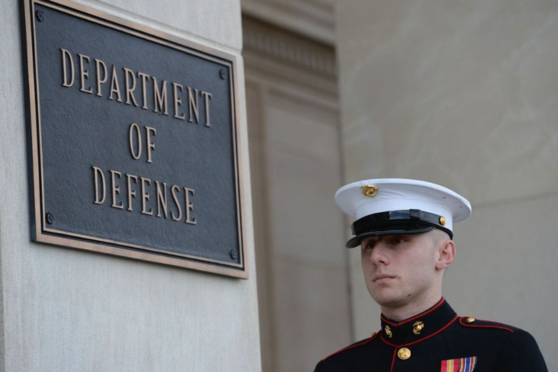 2014年1月13日,美軍儀仗隊士兵在五角大樓外參加儀式。(新華社記者殷博古攝)