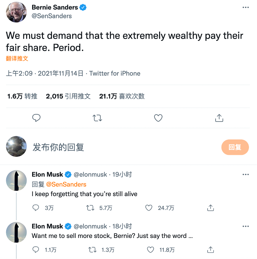 “我老是忘了您還活着。”當地時間11月14日,特斯拉CEO埃隆·馬斯克在推特上多次回覆桑德斯的一條關於“富豪税”的推文,即“那些極度富有的人應該繳納相應份額的税。”