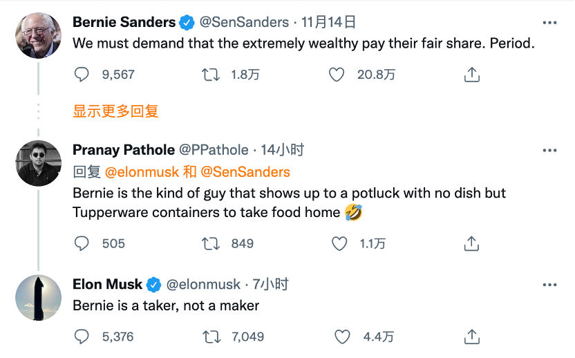 或許感覺還沒“盡興”。當地時間11月15日早間,馬斯克又一次回覆桑德斯推特,“伯尼是個索取者,而非創造者。”