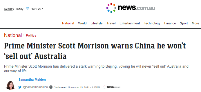 澳大利亞新聞網、澳大利亞《世紀報》15日消息,莫里森當天又出來炒作中國議題,聲稱支持此前發表涉華錯誤言論的自家議員帕特森,還宣稱不會“出賣”澳大利亞及其言論自由。據報道,這是他對中國駐澳大使館此前回擊的再回應。