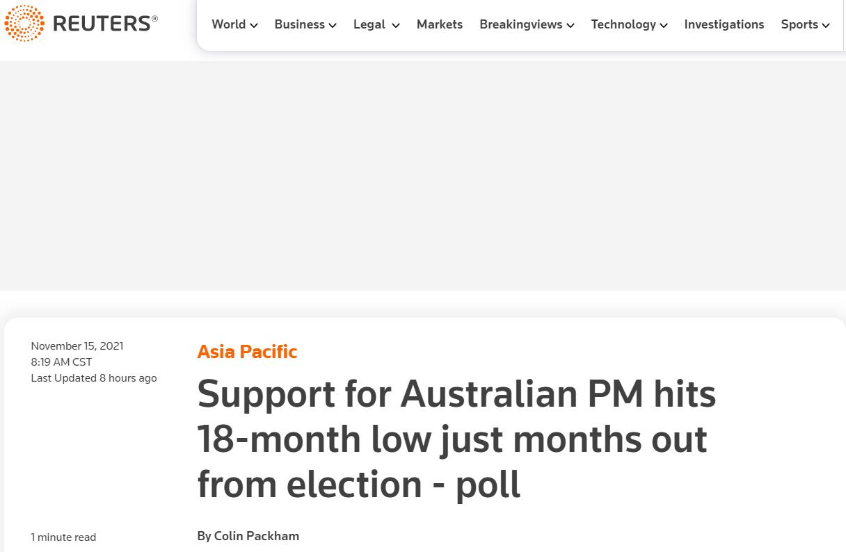 路透社稱,莫里森希望放寬疫情限制措施,以及經濟增強的跡象有助於他2022年獲得連任,不過這項民調的結果對於莫里森來説是一次打擊。