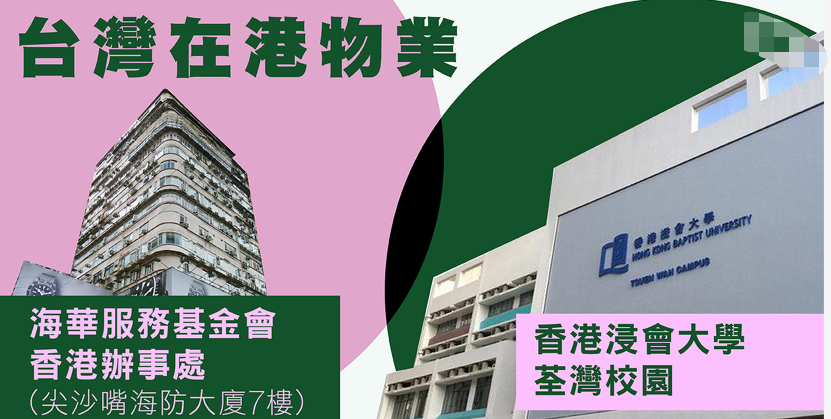報道稱,據悉,民進黨當局在香港的不動產尚有兩處,一處是位於九龍半島尖沙咀的舊建築物,現交給海華基金會做為招生使用,協助港人赴台、就學、考試分發等業務。另一處是位於香港新界的“荃灣校產”建築物,市值約4億元新台幣,現由台“教育部”負責督導管理,出租給香港浸會大學。