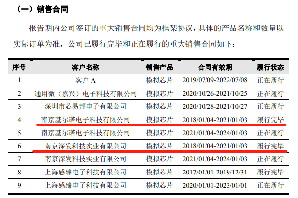 納芯微招股書還披露,南京基爾諾是公司報告期內的大客户,南京基爾諾包括南京基爾諾電子科技有限公司、南京深發科技實業有限公司。納芯微披露的銷售合同顯示,南京基爾諾電子科技有限公司、南京深發科技實業有限公司分別與公司簽署了重大銷售合同,南京基爾諾電子科技有限公司合同有效期是2018年1月4 日至2021年1月3日,目前已經履行完畢。
