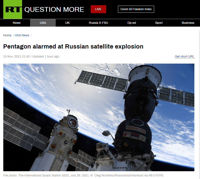 另據“今日俄羅斯”(RT)15日報道,五角大樓對俄羅斯“衞星爆炸”感到警惕。