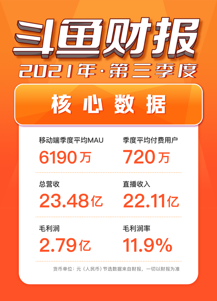 第三季度,鬥魚移動端季度平均MAU從2020年同期的5960萬增長到6190萬,再創新高。背靠多元化的內容體驗和濃厚的遊戲社區氛圍,該季度鬥魚付費用户數保持在較高位,達720萬;總營收為23.48億元,其中直播收入22.11億元;實現毛利潤2.79億元,對應毛利率為11.9%。