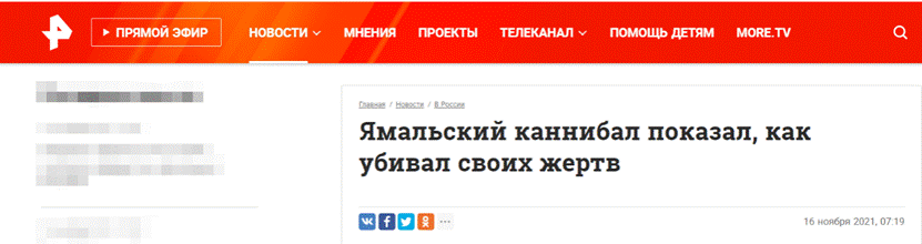 衞星通訊社提到,亞德涅殺人後對受害者進行分屍,還吃了受害者的一些肉。REN-TV網站則稱,這名行兇者在殺害3人後就着他們的肉喝伏特加。