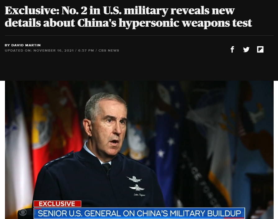 據美國哥倫比亞廣播公司CBS新聞11月16日報道,海頓在接受這家媒體的獨家採訪時,爆料今年夏天所謂“中國高超音速武器試驗”的新細節,稱該試驗讓一枚導彈以超過5倍音速的飛行速度環繞世界飛行。