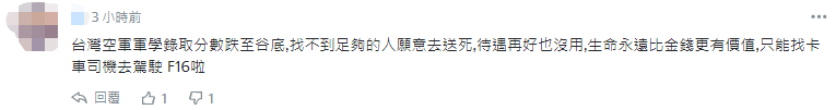 另有網友表示:台空軍學院錄取分數跌至谷底,找不到足夠的人願意去送死,待遇再好也沒用,生命永遠比金錢更有價值,只能找卡車司機去駕駛 F16啦。↓