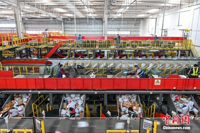 資料圖:工作人員將快遞包裹放入分撥傳送帶上。中新社記者 陳驥旻 攝