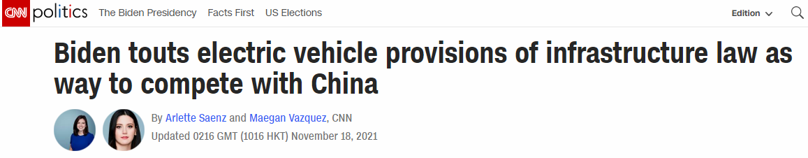 “拜登誇耀基建法案中的電動汽車條款,以此作為與中國競爭的方式。”美國有線電視新聞網(CNN)18日以此為題報道稱,基建法案通過後,拜登當地時間17日前往該國密歇根州底特律,宣傳這份法案中的電動汽車條款。報道稱,拜登想以此説明這份計劃是美國和中國在電動車市場進行競爭的一種方式,從而提振美國的國內供應鏈。