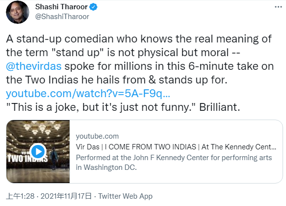 CNN稱,11月12日,喜劇演員維爾·達斯(VirDas)在華盛頓約翰·肯尼迪表演藝術中心表演了題為“我來自兩個印度”的演出,描述了他所認為的印度“雙重人格”。報道稱,達斯15日將演出上傳到YouTube,他的六分鐘演出視頻目前已獲得超過85萬次觀看。