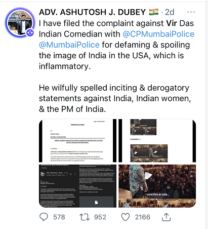 CNN提到,標籤#VirDas在印度推特上掀起熱潮,截至週三(17日)下午,共有6萬多條推文與該標籤有關。據報道,他的言論引發爭議,印度執政黨印度人民黨的法律顧問阿舒託什·杜貝稱,他16日已向孟買警方投訴了達斯的“煽動性”言論,此外,他還指責達斯“誹謗並破壞了印度在美國的形象”,“污衊印度國家、印度女性、印度總理”。CNN還稱,印度電影製片人阿肖克·潘迪特認為,發表這種言論的達斯 “應該立即被逮捕”,並在推特上稱“我在這個叫#VirDas的人身上看到了恐怖分子的影子”。