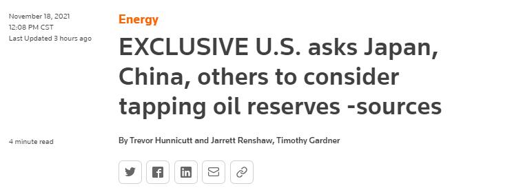 RT稱,對此韓國已暗示拒絕。路透社稱,韓國相關部門18日發佈一份聲明,稱“我們正在仔細研究美方請求,但我們不會因為油價上漲而釋放石油儲備。”“我們可以在供應不平衡的情況下釋放石油儲備,但不會以此應對油價上漲。”韓國方面表示。
