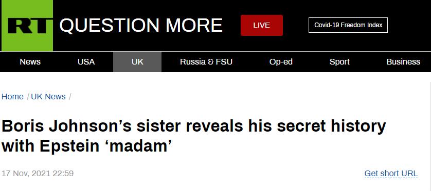 【環球網報道】據“今日俄羅斯”(RT)17日報道,英國首相約翰遜的妹妹雷切爾爆出一記猛料稱,美國戀童癖億萬富豪愛潑斯坦的前女友、也是推介安排年輕女性供富豪權貴淫樂的“鴇母”——吉斯萊恩•麥克斯韋曾在牛津大學的一間公共休息室內將“一隻高跟鞋”放到約翰遜的大腿上。