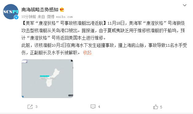 “南海戰略態勢感知”計劃平台11月18日發佈消息稱,美國海軍的“康涅狄格”號核潛艇當天從關島港口駛出。