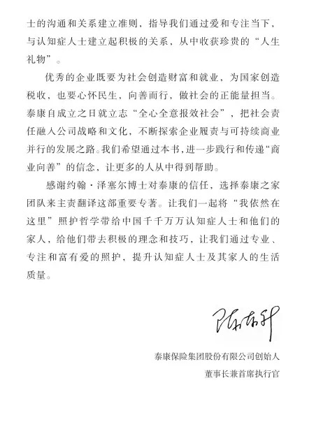 *泰康保險集團創始人、董事長兼CEO陳東昇為本書傾情作序。*陳東昇董事長説到,讓我們一起將“我依然在這裏”照護哲學帶給中國千千萬萬認知症人士和他們的家人,給他們帶去積極的理念和技巧,讓我們通過專業、專注和富有愛的照護,提升認知症人士和家人的生活質量。