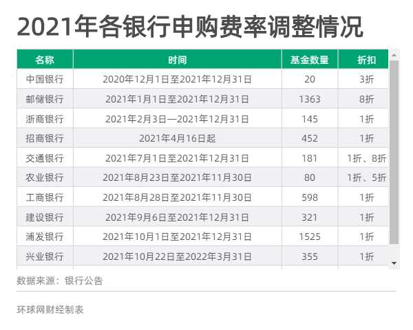 郵儲銀行於2021年1月1日起,繼續開展個人網商銀行和手機銀行基金申購費率優惠活動,指定開放式基金產品,其申購費率優惠8折。隨後,浙商銀行、招商銀行、交通銀行等紛紛降低申購費率折扣。