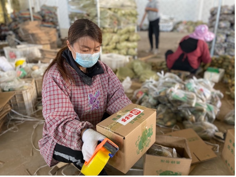 劉大姐在劉鳳珍這裏打包已有四五年。平日種地,空閒就來掙點閒錢日常開銷。熟練工一天可以打包500件,日結工資達兩三百元。和劉大姐一樣閒不住,利用空閒時間在周圈打零工兼顧家裏的大姐還有很多。她們拼工作拼生活,雖然辛苦,但臉上滿是笑容。