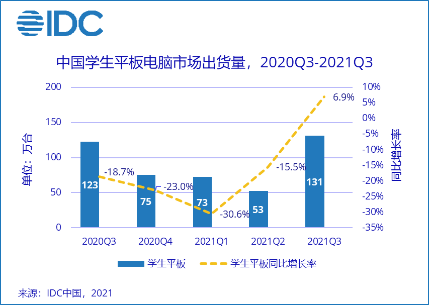 【環球網科技綜合報道】11月18日,IDC最新發布的學生平板電腦季度跟蹤報告顯示,2021年第三季度中國學生平板電腦市場出貨量約為131萬台,自從去年下半年連續4個季度同比下滑之後觸底反彈,實現同比增長6.9%。