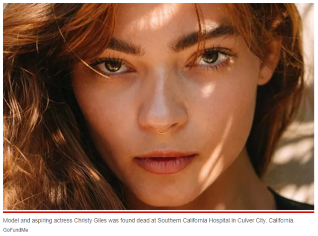 據《紐約郵報》17日報道,上週六晚,美國模特兼演員克里斯蒂·賈爾斯(Christy Giles)的屍體被丟棄在洛杉磯一家醫院外,她的突然死亡被懷疑與謀殺有關。