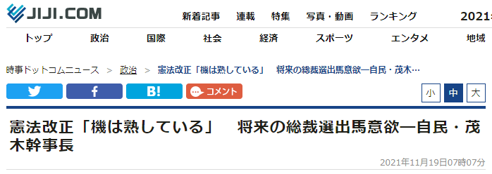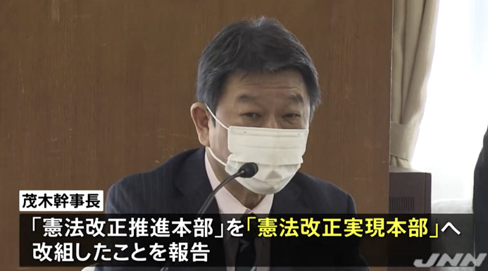 時事通訊社19日放出了採訪內容。茂木敏充聲稱,修改憲法“時機已到”,將朝達成啓動修憲程序並實施國民投票這個目標努力。茂木在採訪中宣稱,“在眾議院中對修憲持積極看法勢力增加了,這是事實”,將在參眾兩院憲法審查會推進議程。茂木還表明將自民黨內機構“推進修憲本部”改組為“實現修憲本部”,聲稱“在自民黨(10月發表的)‘政綱’中已使用了‘實現’這個詞,(與推進相比)更具責任感。”此外,據時事通訊社另一篇報道,自民黨還在19日新設“修憲國民運動委員會”,凸顯該黨對修憲的態度。