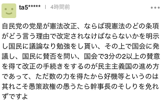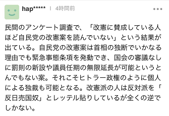 此外,還有網友評論稱:“非官方民調結果顯示,‘越是贊成修憲的人,越不瞭解自民黨的修憲方案’。根據自民黨的修憲方案,首相可以憑一己之見用任何理由發動緊急事態條項,在不經過國會審議的情況下增加懲罰條款或延長議員任期。甚至能夠實現像希特勒政權那樣的獨裁政治。”