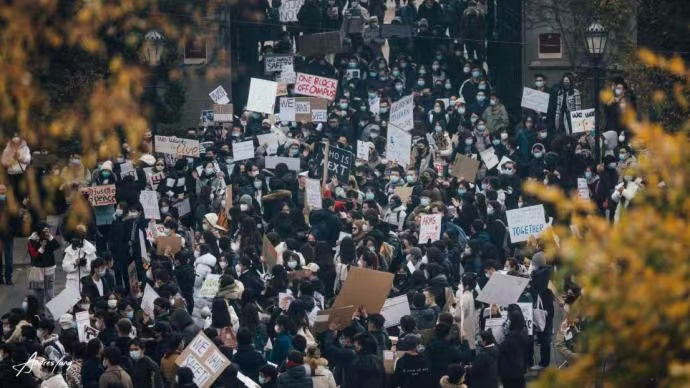 當地時間11月16日11時,在芝加哥大學校園中心,300餘名該校大學生自發組織了一場遊行。他們高聲呼喊着口號:“我們來到這裏是為了學習,而不是送死。”