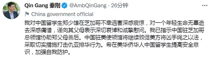 當地時間18日,中國駐美國大使秦剛用中英雙語發推稱,對此深感震驚, 並敦促美方將兇手繩之以法。