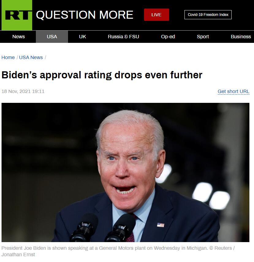 RT評論稱,隨着2022年中期選舉的臨近,拜登支持率的下降對民主黨人來説是一個令人不安的趨勢。昆尼皮亞克大學的民調顯示,美國受訪者希望共和黨人分別以46%對38%和46%對40%的優勢從民主黨手中奪取眾議院和參議院的控制權。獨立人士則希望共和黨人41%對31%和44%對34%的優勢奪取眾、參兩院的控制權。