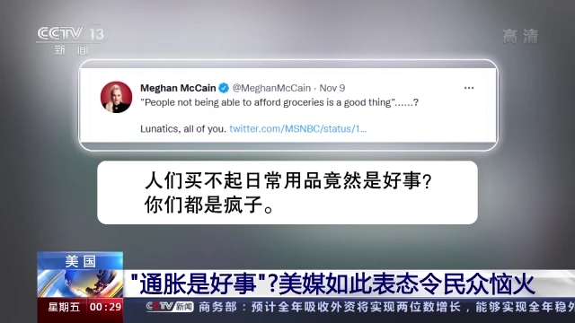 與此同時,美國微軟-全國廣播公司網站上刊登了一篇文章,認為通貨膨脹是好事,對於為什麼得出這樣的結論,文章給出的理由是,通貨膨脹反映了經濟正在快速增長。美國前資深資深參議員約翰·麥凱恩的女兒梅根麥凱恩對此怒斥:“人們買不起日常用品竟然是好事?你們都是瘋子。”