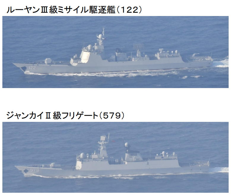 日本防衞省統合幕僚監部11月19日發佈消息稱,日本海上自衞隊於11月18日在對馬島以東約40公里的海域發現兩艘向西南方向航行的中國軍艦,經確認為052D型驅逐艦唐山艦和054A型護衞艦邯鄲艦,兩艦隨後沿着對馬海峽南下,向東海方向航行。日本自衞隊出動了一艘導彈艇進行情報收集和警戒監視。