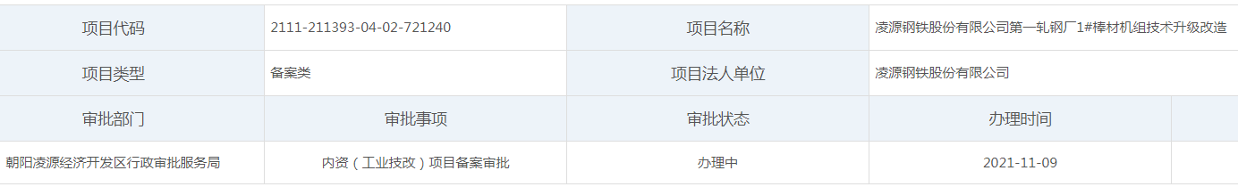 日前,遼寧省投資項目在線審批監管平台顯示,凌源鋼鐵股份有限公司(下稱:凌鋼股份,600231.SH)第一軋鋼廠1#棒材機組技術升級改造項目進入審批階段。這是凌鋼股份緊接着超低排放改造(二期)工程--第二鍊鐵廠5#高爐礦槽除塵器改造工程開展後的又一節能減排升級項目。
