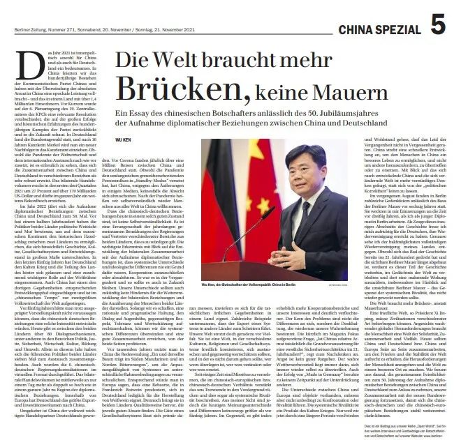 11月20日,德國《柏林報》(Berliner Zeitung)刊登吳懇大使署名文章《世界需要更多的“建橋者”而不是“建牆者”》,全文如下: