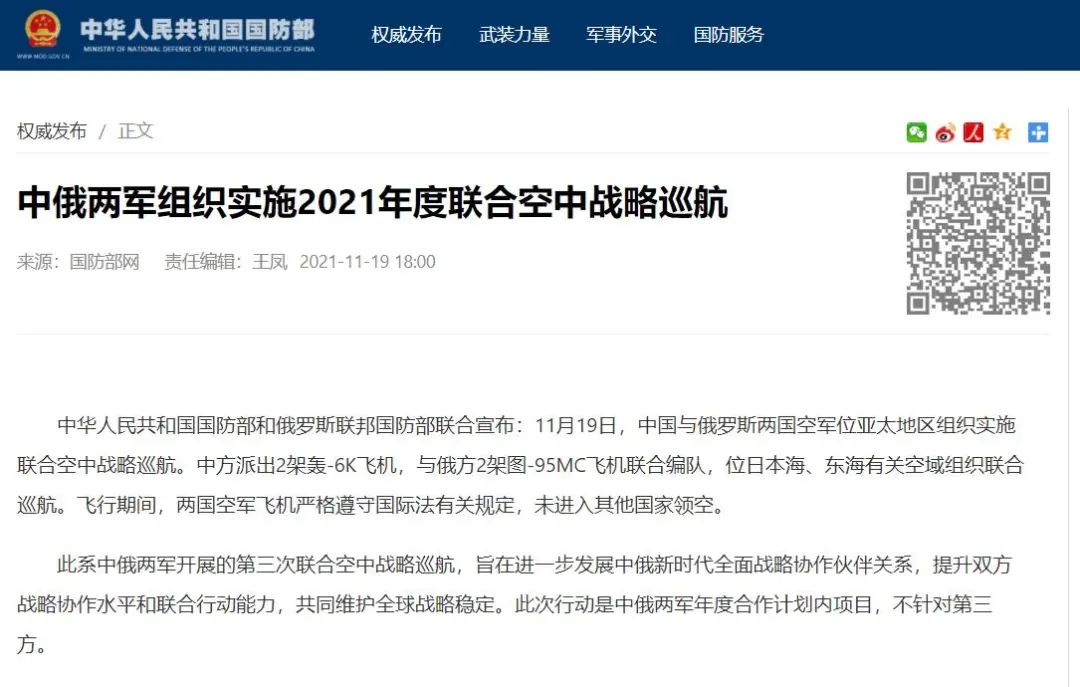 正如中俄強調的中俄雙方的“聯合巡邏嚴格按照國際法規定進行,沒有任何侵犯外國領空的行為發生。”換話句話説,就是沒有任何瑕疵可以挑剔的,某些心中有鬼的人別想太多了,因為這是“中俄兩軍年度合作計劃內項目,不針對第三方”。