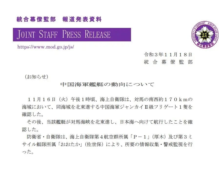 日本防衞省稱,11 月 16 日下午 1 點左右,海上自衞隊在對馬西南約 170 公里處發現舷號為548的中國海軍護衞艦通過對馬海峽駛向日本海。548號艦為054A型導彈護衞艦益陽艦。