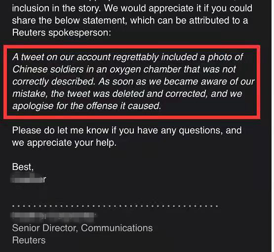 路透社19日晚給環球時報發來的郵件稱,他們看到了環球時報和環球網關於路透社在一篇報道中使用錯誤配圖引發中國網民公憤的報道。“令人遺憾的是,我們賬户上的一條推文包含了一張中國士兵在氧氣艙裏的照片,但沒有被正確描述。”路透社在發現錯誤後便“立刻”刪帖並更正了,並稱“我們為此事所引發的冒犯而道歉”,並請環球時報發佈其聲明。