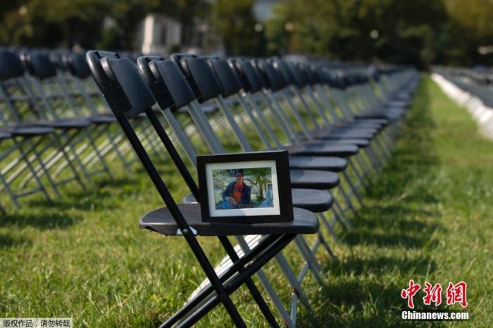 當地時間2020年10月4日,美國首都華盛頓,2萬把椅子擺放在白宮外南側草坪上,悼念美國超過20萬新冠逝者。