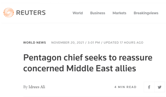 路透社表示,一位不願透露姓名的美高級國防官員表示,預計奧斯汀此行不會在地區做出新承諾,與此同時,目前尚不清楚奧斯汀的講話會對華盛頓在中東的盟友產生多大影響,因為他的講話也沒有宣佈在該地區進一步部署或出售新武器。