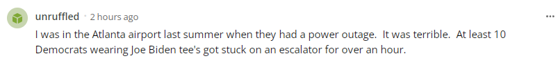 還有網友還提到了之前的經歷,“去年夏天他們停電時我正好在亞特蘭大機場。太糟糕了。至少10名身穿喬·拜登T恤的民主黨支持者被困在自動扶梯上超過一個小時。”