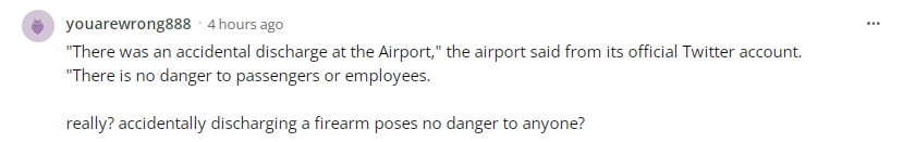 有網友對於機場發佈在其推特賬户上的內容表示質疑,機場稱這是一起“意外事故”,“對乘客和員工都沒有危險”。“真的?意外開槍不會對任何人造成危險?”