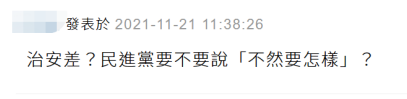 還有網友諷刺,“治安差?民進黨要不要説‘不然要怎樣’?”↓