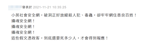 也有網友表示,蔡英文提出的“社會安全網”,的“破洞正好放縱殺人犯、毒蟲,卻牢牢網住善良百姓!”↓