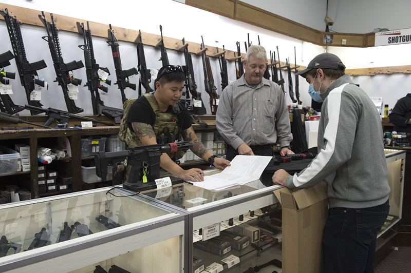 資料圖:美國槍店工作人員為顧客選購彈藥。