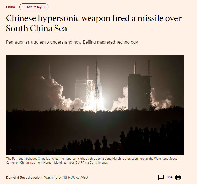 《金融時報》的這篇報道援引一名所謂的“知情人士”的話稱,今年七月中國進行試驗的高超音速武器,是一種可攜帶核彈頭的高超音速滑翔飛行器。這款高超音速飛行器在南海上空大氣層的飛行過程中,發射了一枚導彈。該“知情人士”稱,此前沒有任何國家展示過這種能力。中國高超音速武器的這一進展“讓五角大樓的科學家們措手不及”。