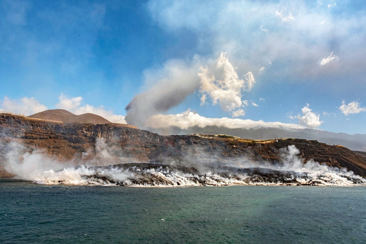 老昆布雷火山9月19日開始噴發。據德新社報道,噴出的岩漿覆蓋島上1050公頃土地,還有部分岩漿流入海中,冷卻後生成新的陸地,面積超過40公頃,相當於50多個足球場。