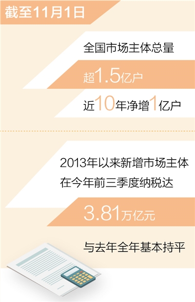 最新數據顯示,截至11月1日,全國市場主體總量超1.5億户,近10年淨增1億户。億萬市場主體的磅礴力量推動了我國經濟總量、國家財力和社會財富穩定增長,承載了7億多人就業的基本盤。