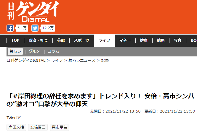 值得注意的是,由於岸田文雄被挖出擔任“廣島縣中日友好協會”會長、岸田政府對華態度被指責“軟弱”等多重因素,據《日刊現代》22日報道,安倍晉三、高市早苗等日本右翼政客的支持者上週末剛剛在日本推特上舉行所謂的“網絡抗議遊行”,關鍵詞“要求首相岸田辭職”衝上熱搜。