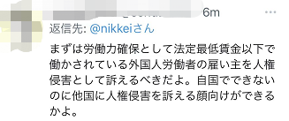 還有網友稱,“應該先指控以低於法定最低收入的薪酬僱傭外國人勞動者的僱主侵犯人權。日本都沒做到,還有臉去以侵犯人權為由指控其他國家?”