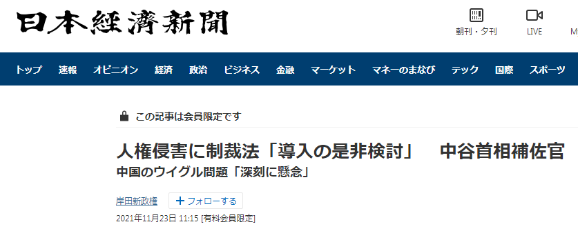 《日本經濟新聞》最新放出的對中谷元採訪中,中谷元還宣稱,關於中國新疆,“有消息表明存在重大人權問題,對此強烈關切”,而針對香港,中谷還聲稱:“接連出現令人非常關切的情況,有損對‘一國兩制’的信賴。”